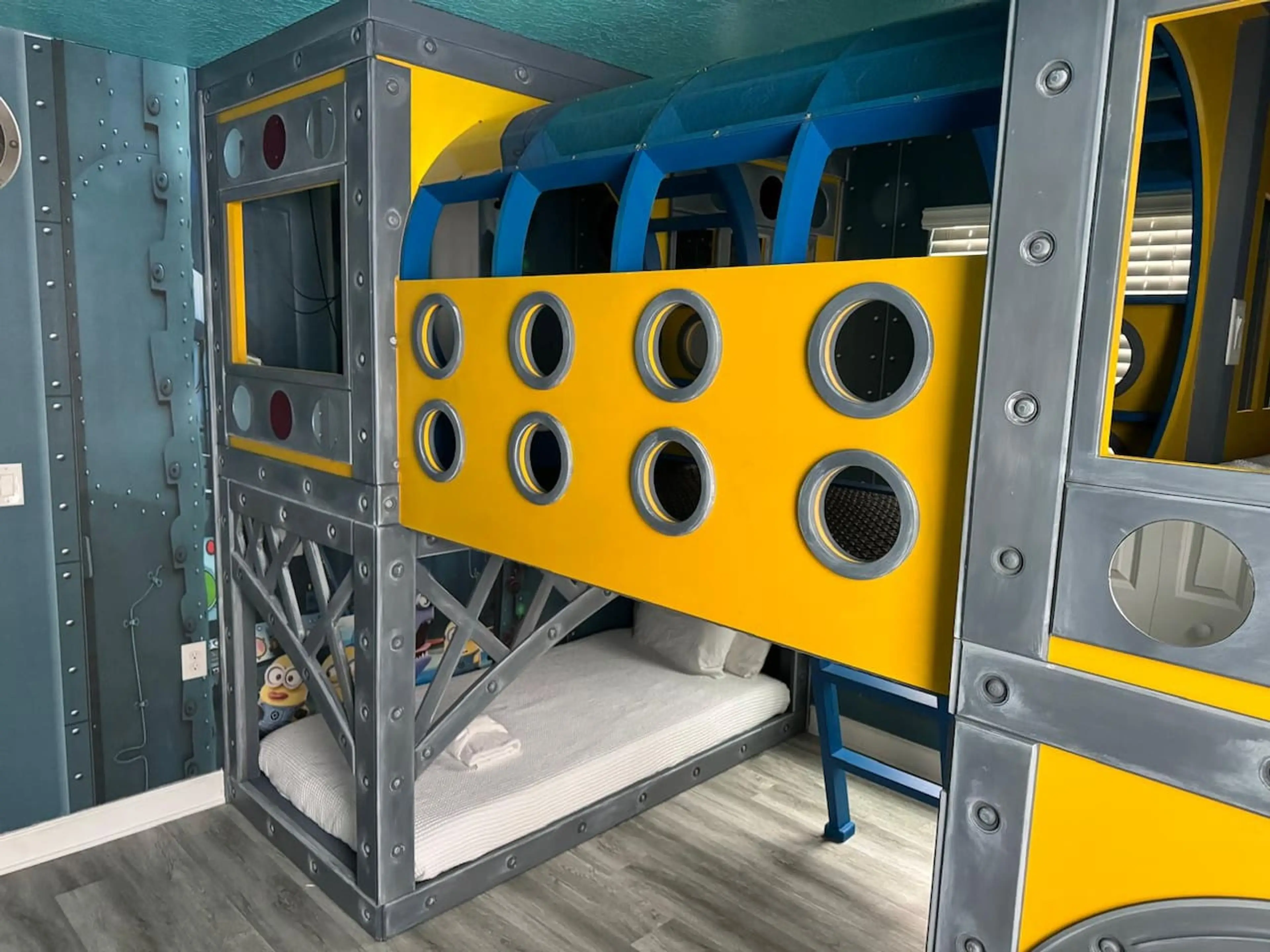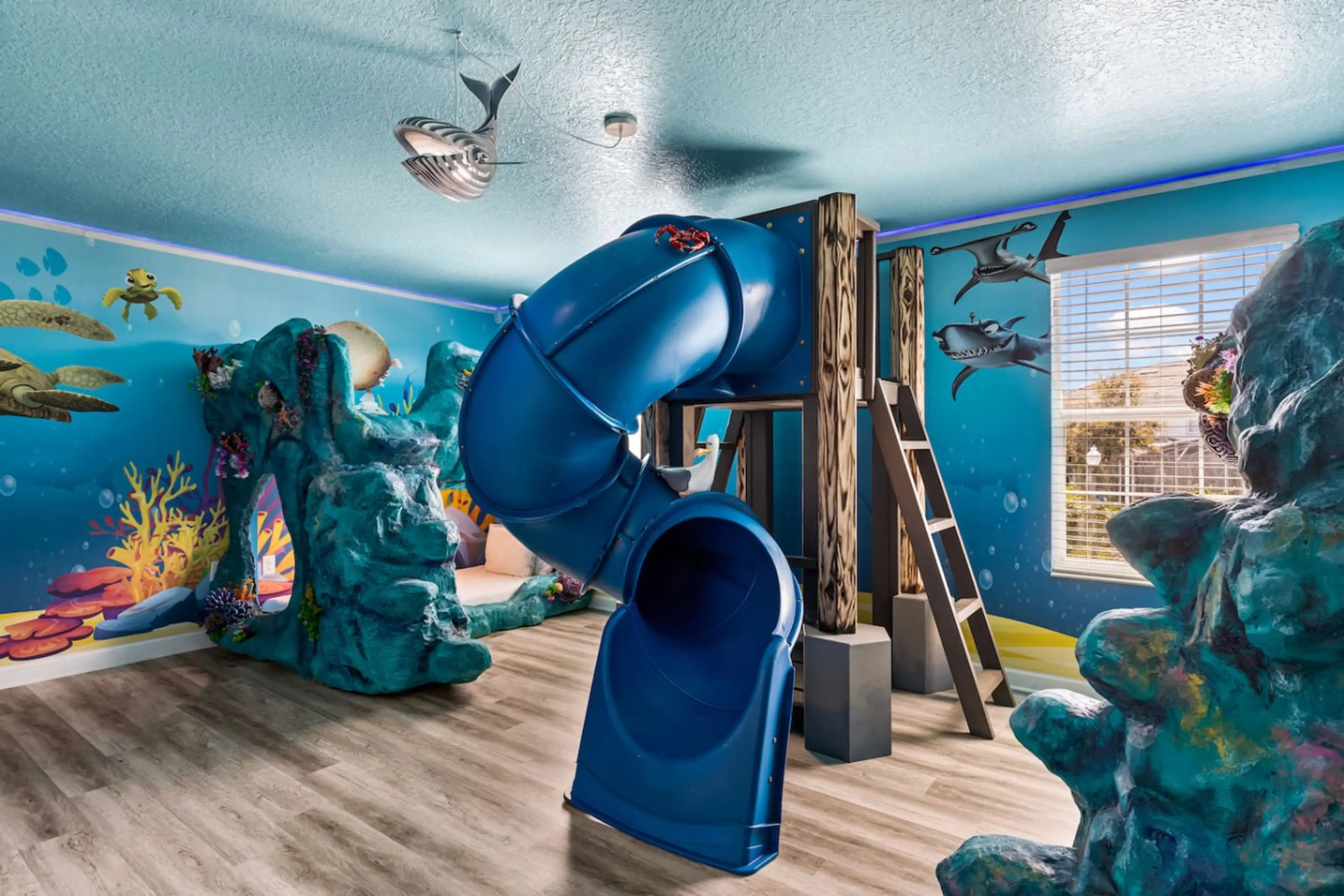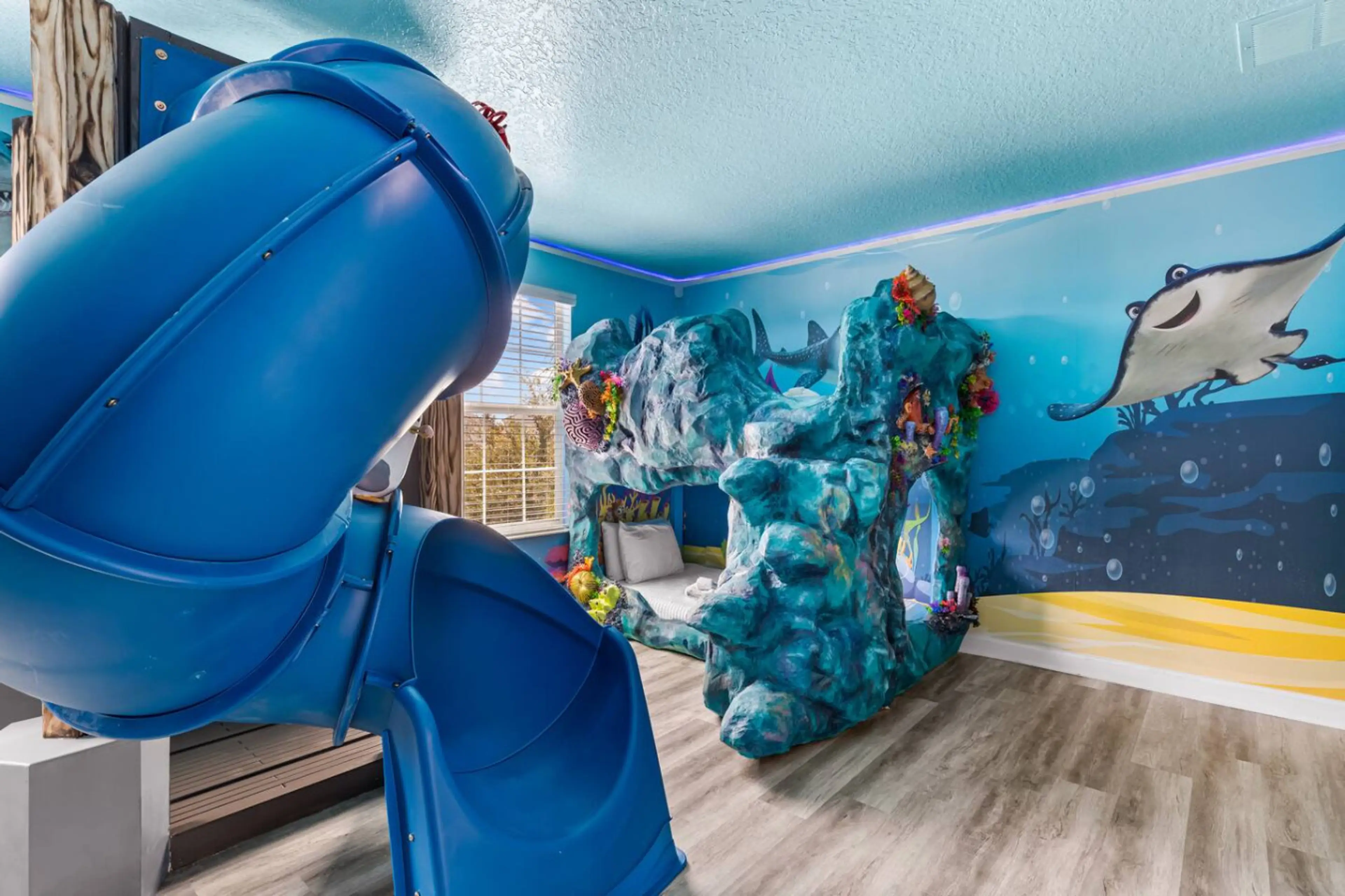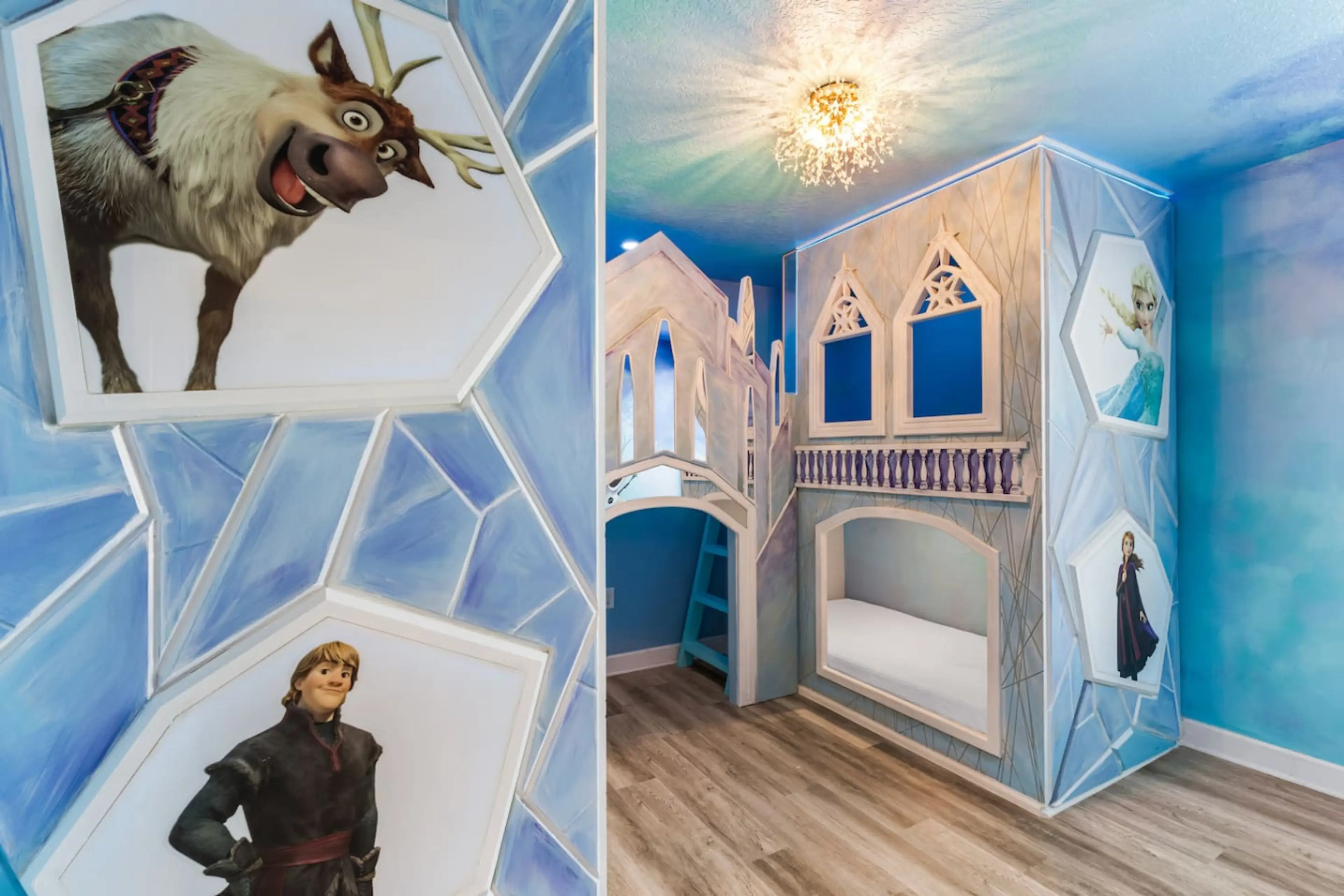 Enjoy the extra space in this nine bedroom Orlando resort vacation home that sleeps up to 24 guests, and features FIVE king beds, one queen bed, private pool & spa (pool/spa heating extra fee), classic games arcade, movie room, baby & kids gear and themed rooms for the kids including Frozen, Minions...