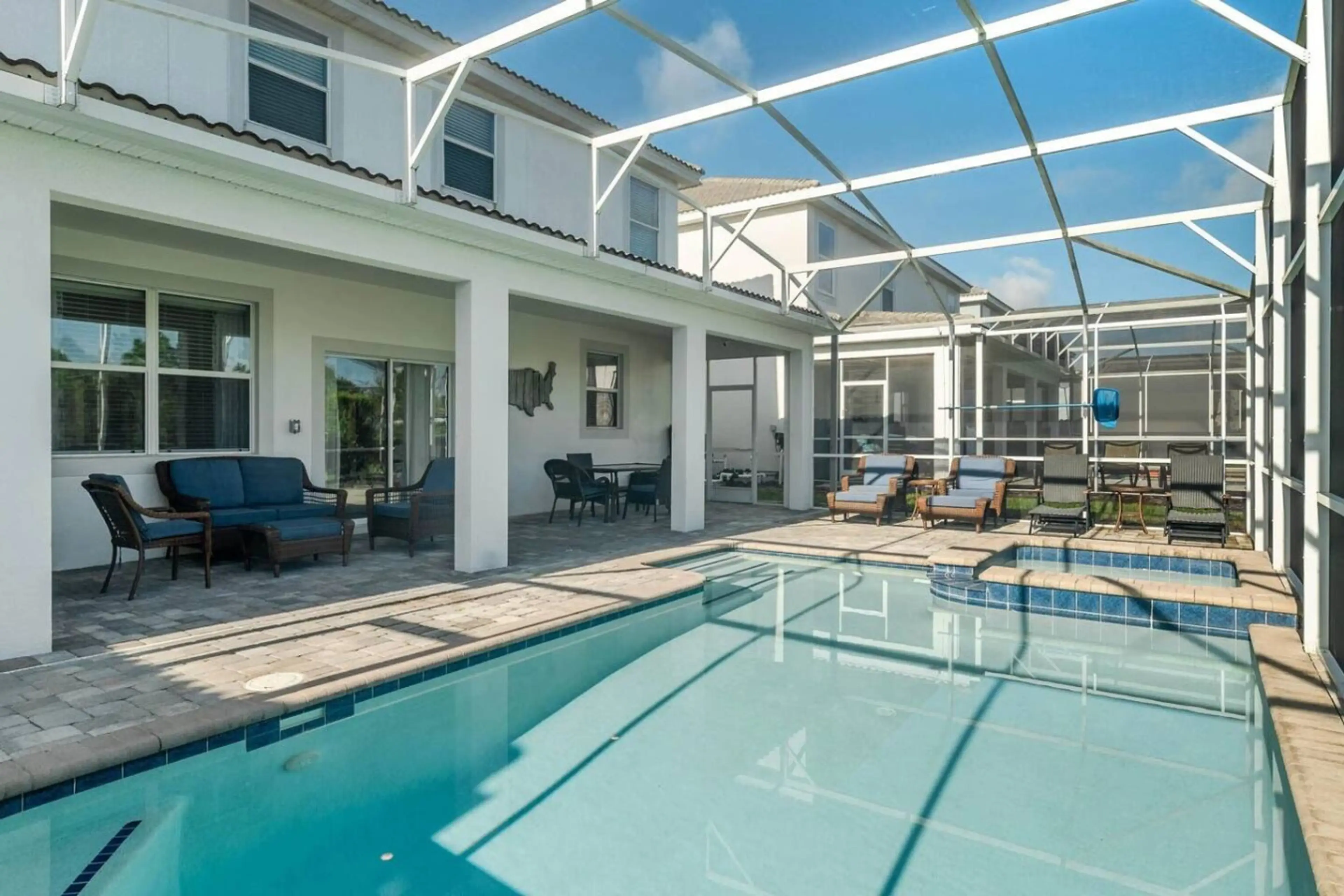 Enjoy plenty of space in this nine-bedroom Orlando resort home, comfortably accommodating 16+ guests. The home offers inviting bedrooms, a private pool and spa (pool/spa heating available for an additional fee), fun themed rooms for the kids, and a peaceful space for adults to unwind. Guests have fu...